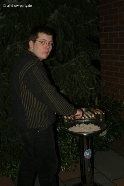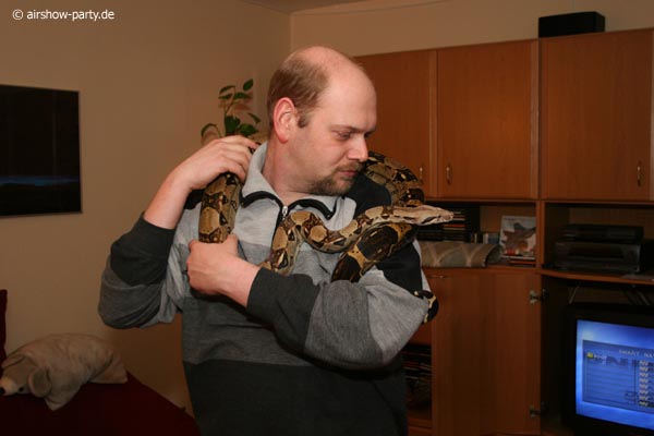 Bevor es jedoch nach Frankfurt ging, trafen wir uns in Freds feudaler Behausung um die „nur noch 77 Tage Party“ bis zum KLu Open Dagen zu begehen. Ein willkommener Anlass den Grill anzuheizen, ein paar kühle, alkoholhaltige Getränke zu vernaschen und uns mit Videos auf das kommende Großereignis in Holland einzustimmen. Als Stargast des Abends fungierte Ka, Freds Boa Constrictor, von der er sich wenige Tage später trennen musste. Pech für das Tier, hätte ein prima Maskottchen abgegeben, Glück für Franzi, sie kann nun ruhiger schlafen.