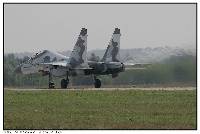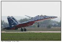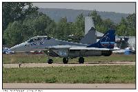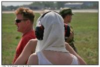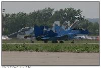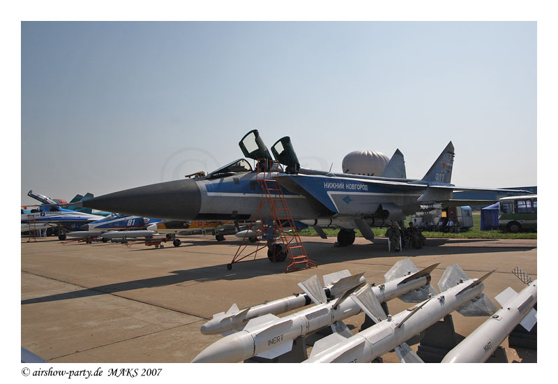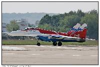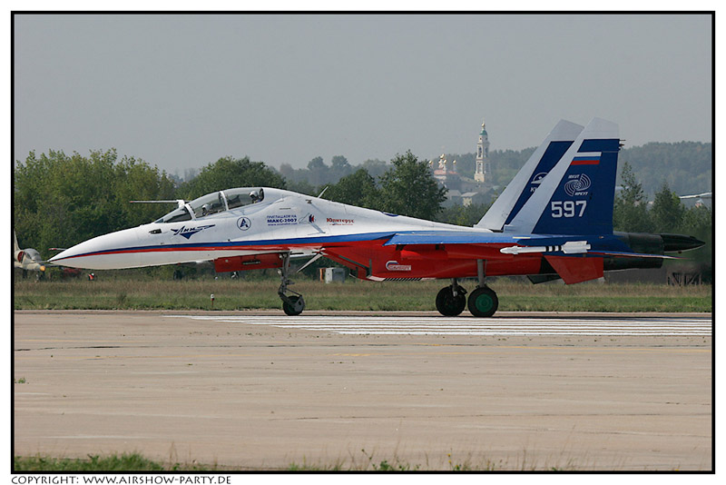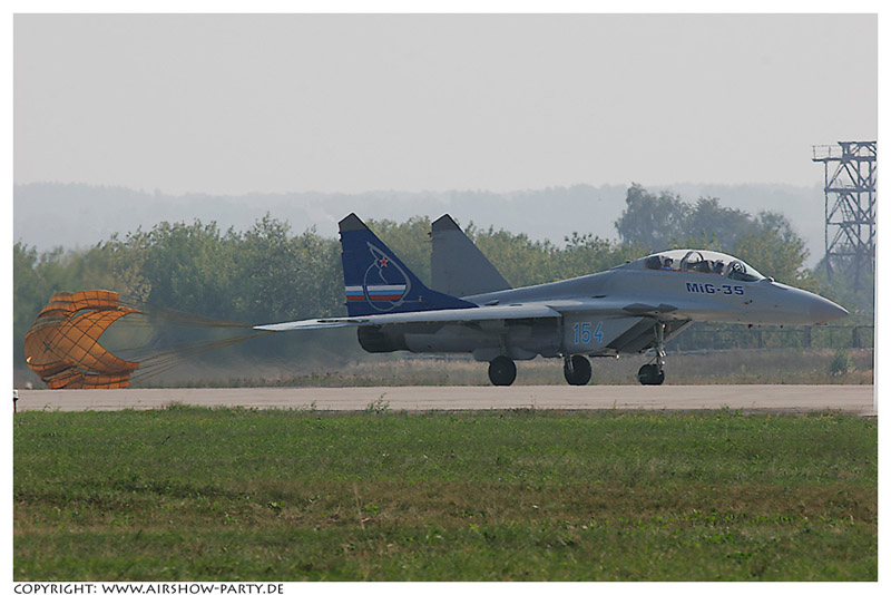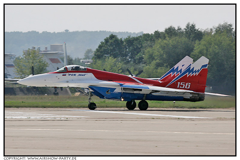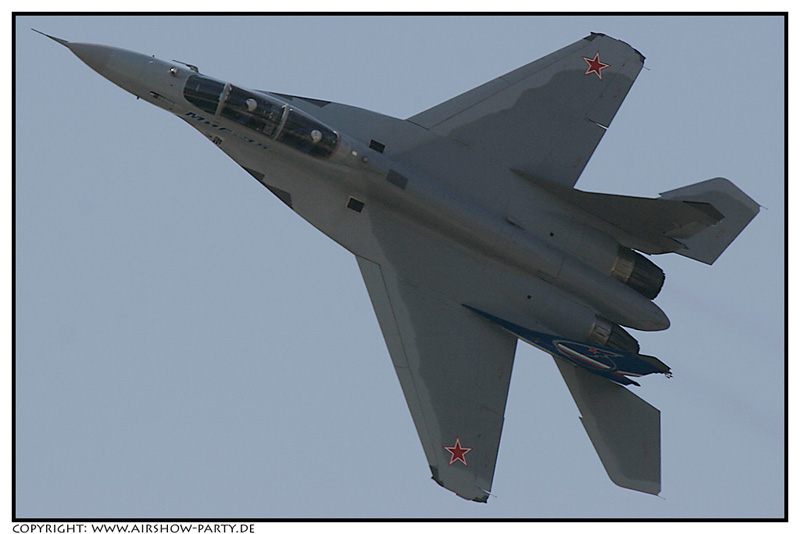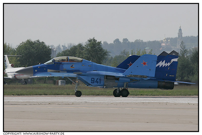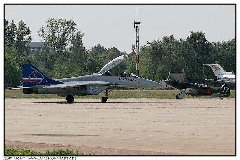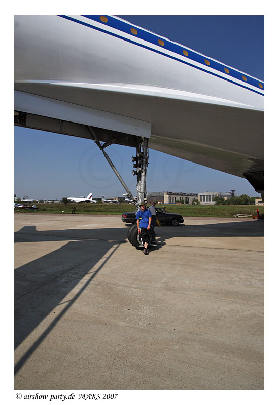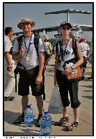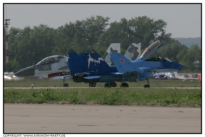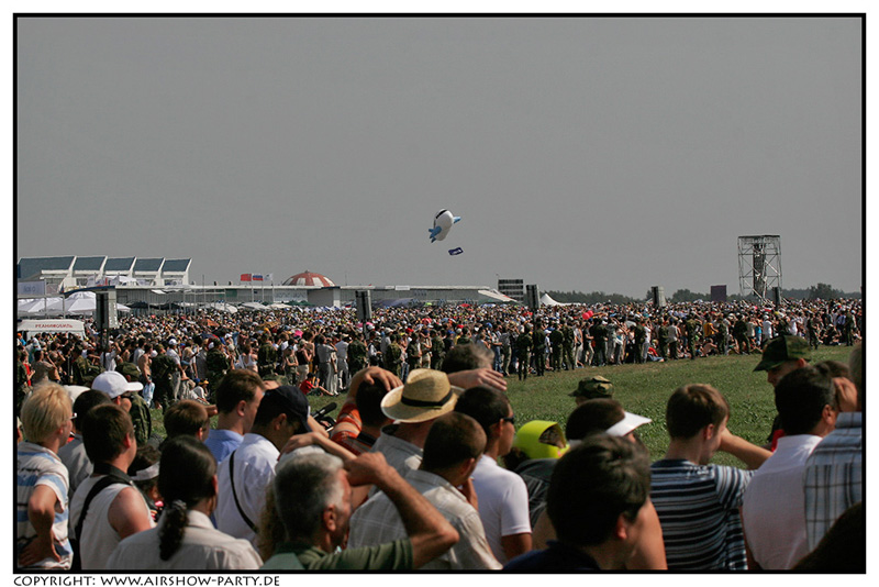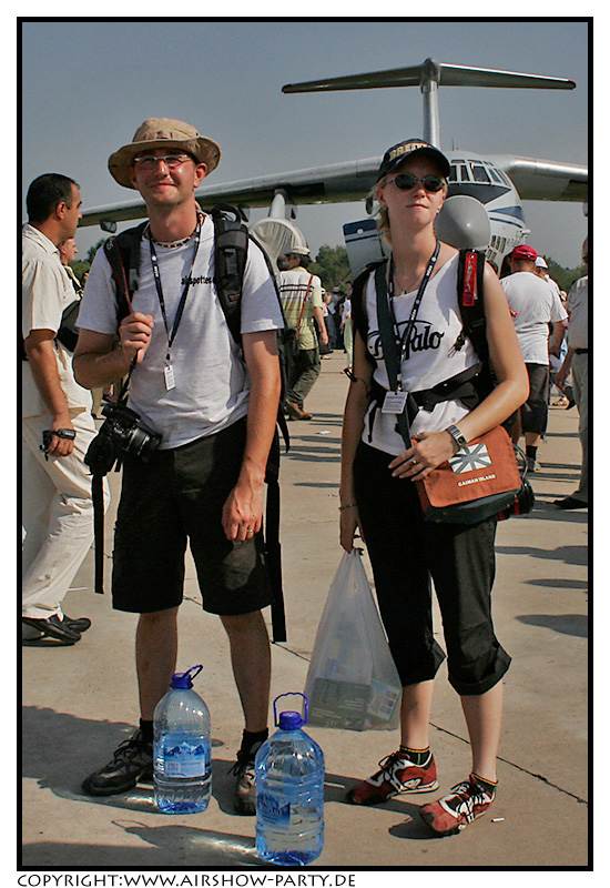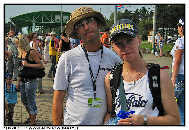МАКС! Vier Buchstaben als Abkürzung für das Spotterparadies. Was sollte uns nicht alles bevorstehen? Suchoj, MiG, Tupolew und Kamov in Verbindung mit illustren Zahlen wie 29, 30, 34, 35, 52, 95 und 160! Das ganze angereichert mit Team Rus, Strischi und Russian Knights. Ein Traum sollte seine Erfüllung erfahren. Sollte. Doch immer hübsch der Reihe nach: Alles war angerichtet am Dienstag, den 21. August: Das Wetter war zwar diesig, aber trocken und heiß. Dank Puck´s famoser Vorbereitung und unserer gleichermaßen attraktiven wie geduldigen Reiseführerin Oksana hielten wir pünktlich unsere Presseausweise in Händen. Prima, fast 50 Euro Fachbesuchertage-Eintritt gespart und einen wichtigen Ausweis gab es gratis dazu. Kaum auf der Base und noch vor der dritten (!!!) Einlasskontrolle taxten die nagelneue MiG 29KUB und die schon legendäre OVT direkt an unserer Nase vorbei. Leider können wir an dieser Stelle nur Bilder der K-Version zeigen (immerhin wahrscheinlich die ersten von zivilen Fotografen), denn kaum waren diese im Kasten, durfte Sascha bei einem Soldaten antreten, der seinen nun folgenden Anschiss, mit dem Ungemach ankündigen Wort „Towarisch“ einleitete. Auf Grund der sprachlichen Unzulänglichkeiten unsererseits blieb uns der Inhalt des nun folgenden, nicht leise vorgetragenen Monologes leider verschlossen. Oxana jedoch fasste diplomatisch und knapp zusammen: „Fotografieren verboten!“ Aha! Was nun folgte wird uns noch lange nachhaltig in Erinnerung bleiben: Die dritte Einlasskontrolle dauerte über 2.5 Stunden! Nun, lieber Leser waren es nicht irgendwelche 2.5 Stunden, nein, es waren die entscheidenden. Denn, während wir uns das Geläuf wund standen, begannen in Himmel über Moskau die Art Flugvorführungen, welche uns zu dieser Reise animierten und deren Zeugen wir bevorzugt innerhalb der Base geworden wären: Eröffnet wurde das flying von einem Überflug bestehend aus TU-334, IL-76LL und der Weltpremiere IL-96-400T. Anschließend tat es richtig weh (hätten wir gewusst, dass wir sie nur noch im static erleben sollten, wir hätten geweint), die Göttin der Gegenwart, die SU-34 zeigte ihr Display, für uns leider nur als grün/blauer Punkt zu erkennen.