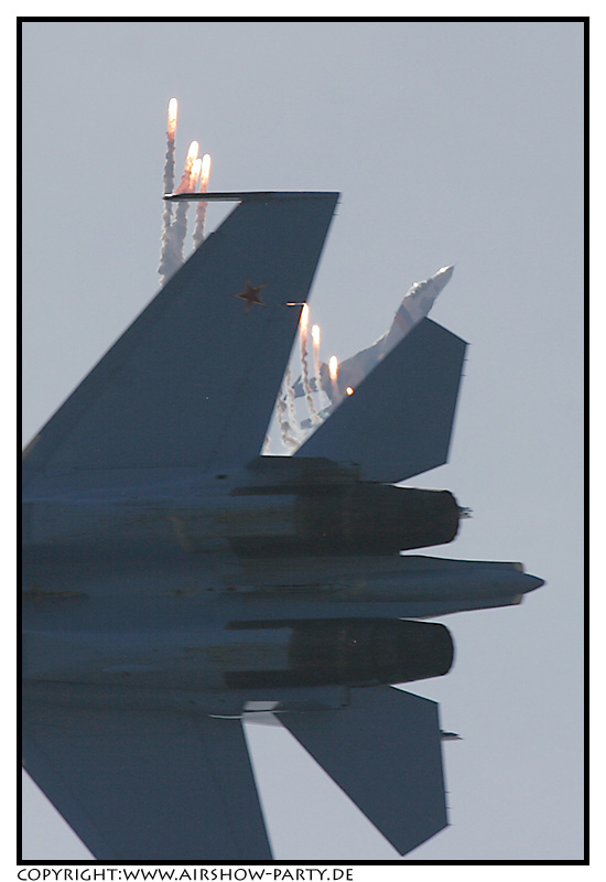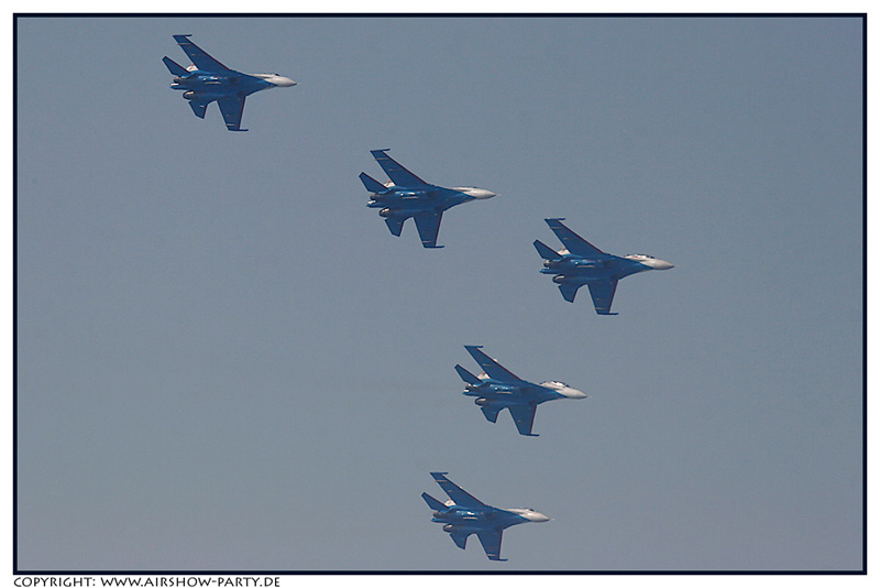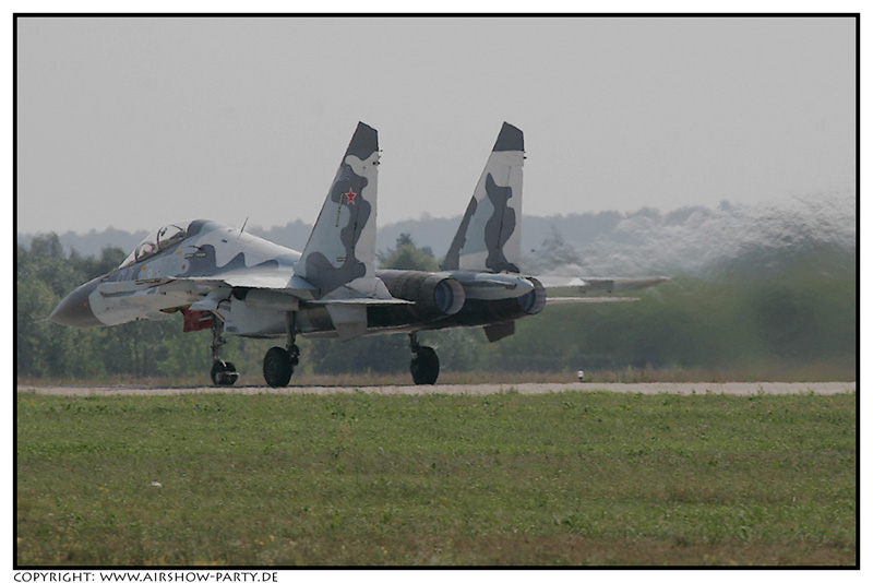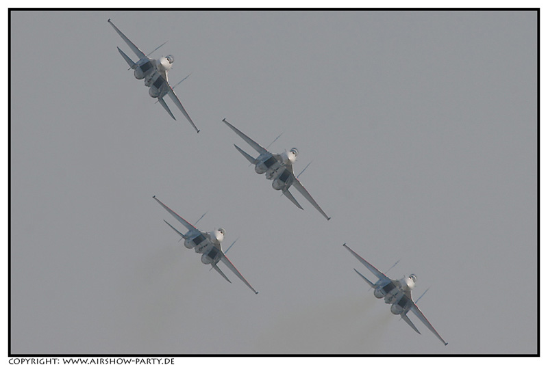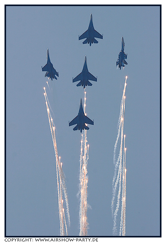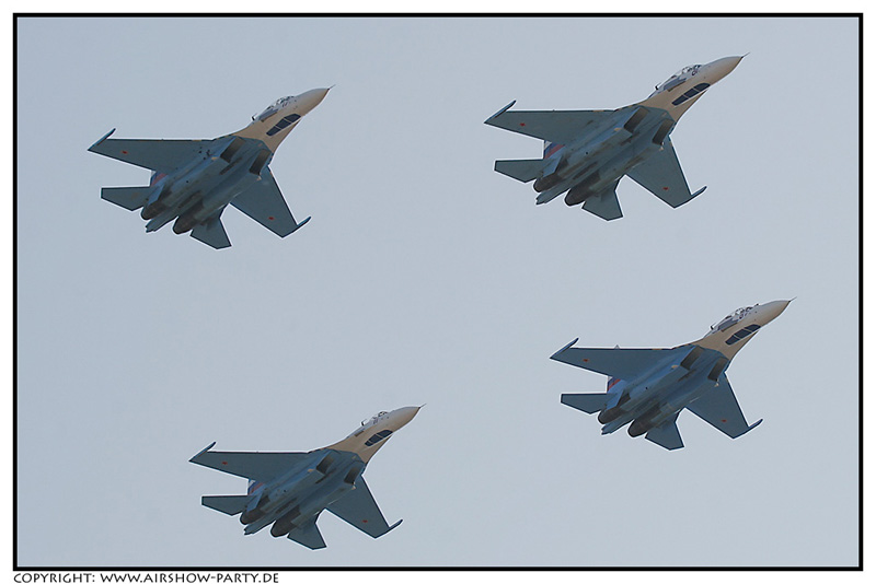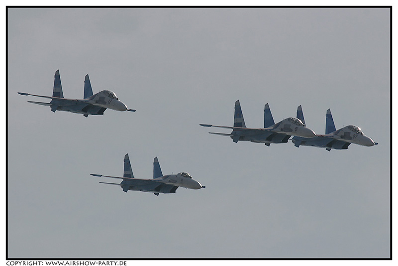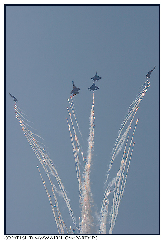 Das am Nachmittag wieder aufgenommene Flugprogramm ließen wir zum großen Teil links liegen. Lediglich der letzte Programmpunkt verlangte noch einmal unsere ungeteilte Aufmerksamkeit, handelte es sich hier um das Team „Sokol“ aus Lipetzk, welches auf SU-27, 2x SU-27UB und einer SU-30 einige Vorbeiflüge, Luftkampfsimulationen und einen Tail-Slide in Formation zeigte. Immerhin etwas.