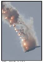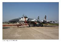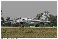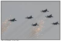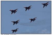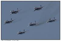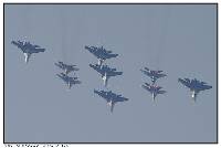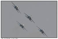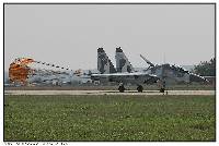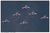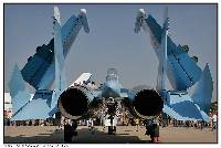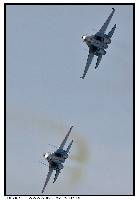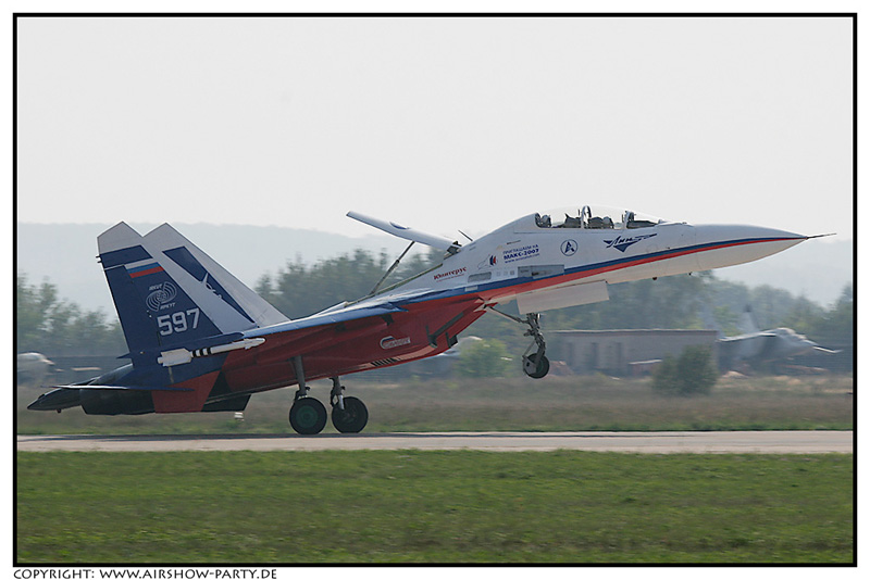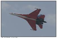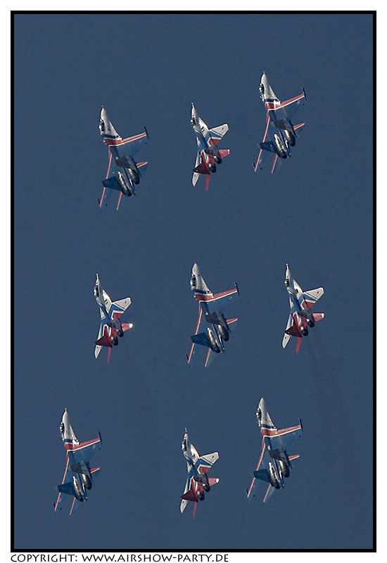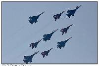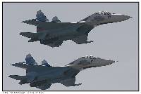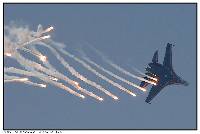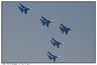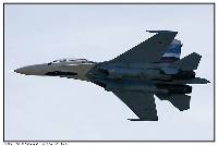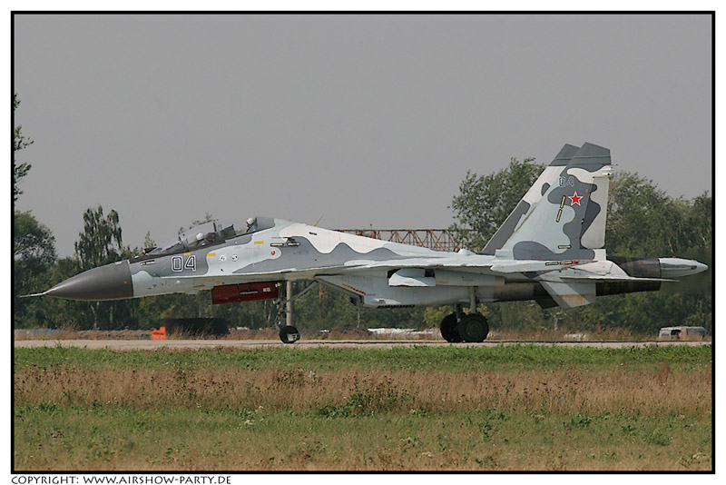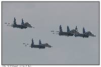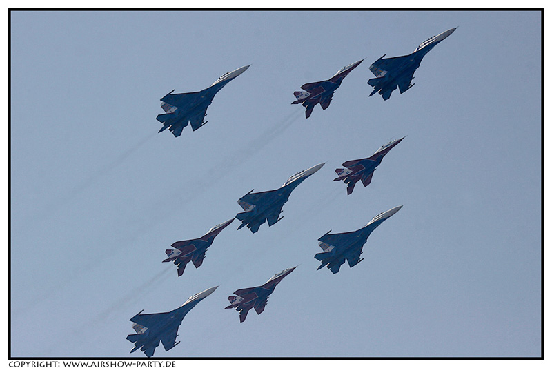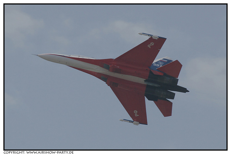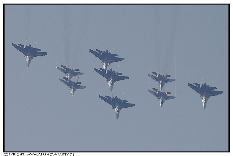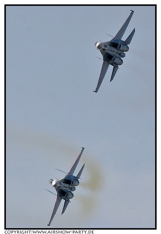Das am Nachmittag wieder aufgenommene Flugprogramm ließen wir zum großen Teil links liegen. Lediglich der letzte Programmpunkt verlangte noch einmal unsere ungeteilte Aufmerksamkeit, handelte es sich hier um das Team „Sokol“ aus Lipetzk, welches auf SU-27, 2x SU-27UB und einer SU-30 einige Vorbeiflüge, Luftkampfsimulationen und einen Tail-Slide in Formation zeigte. Immerhin etwas.