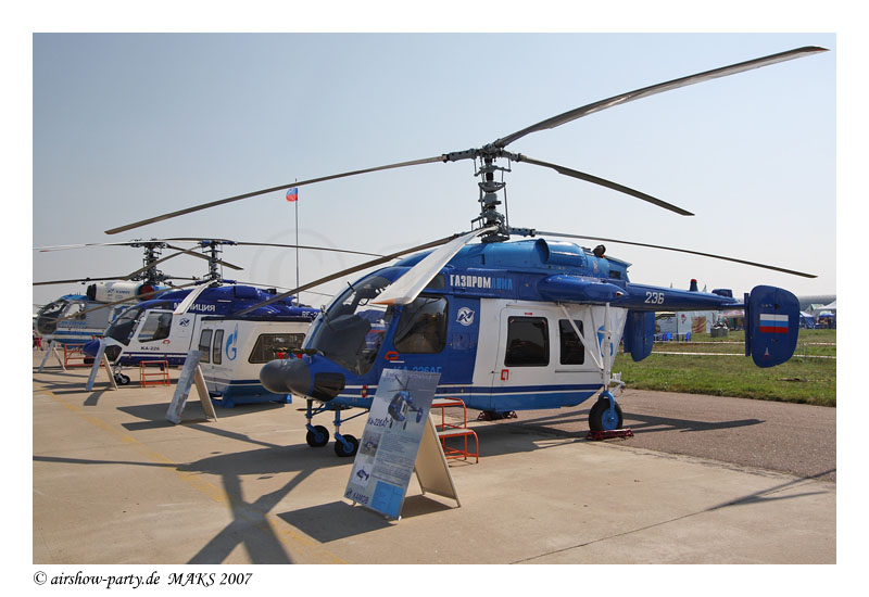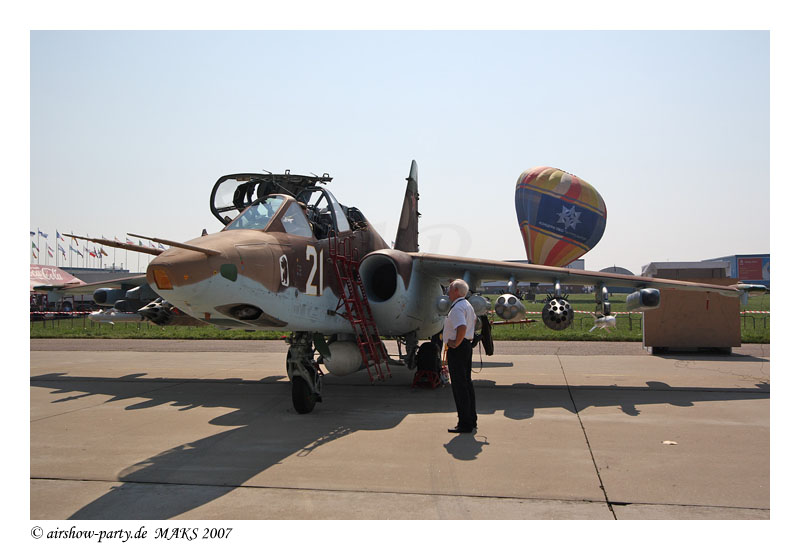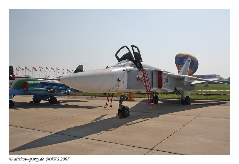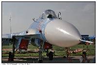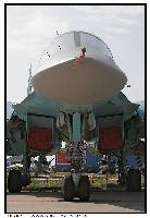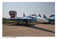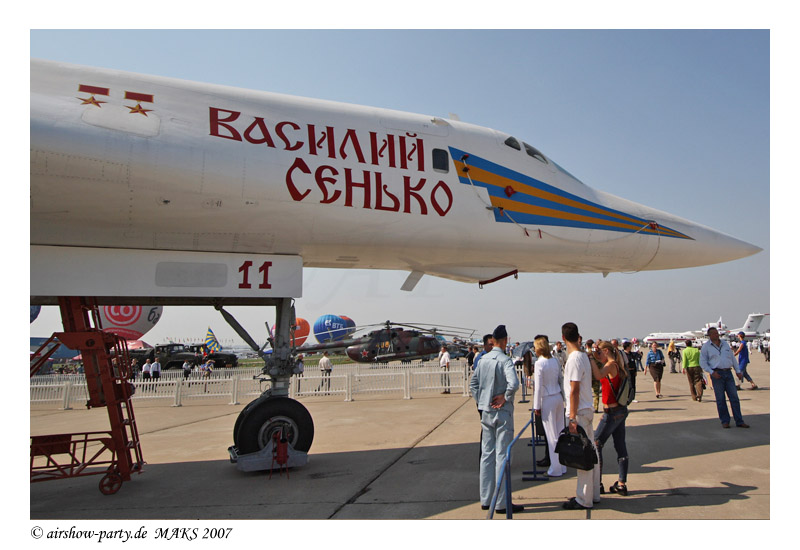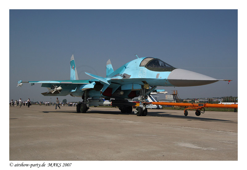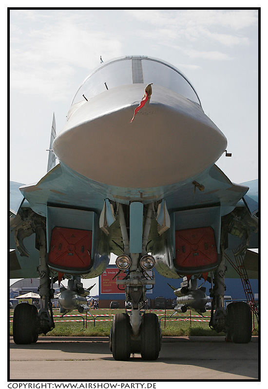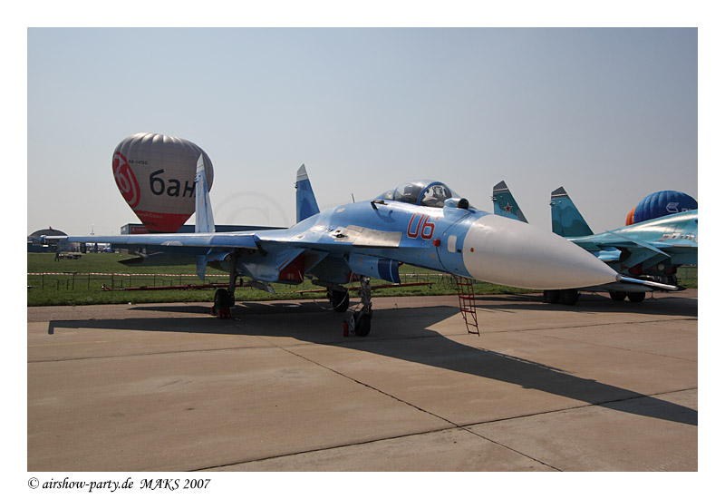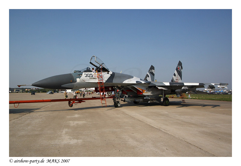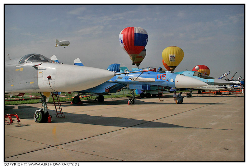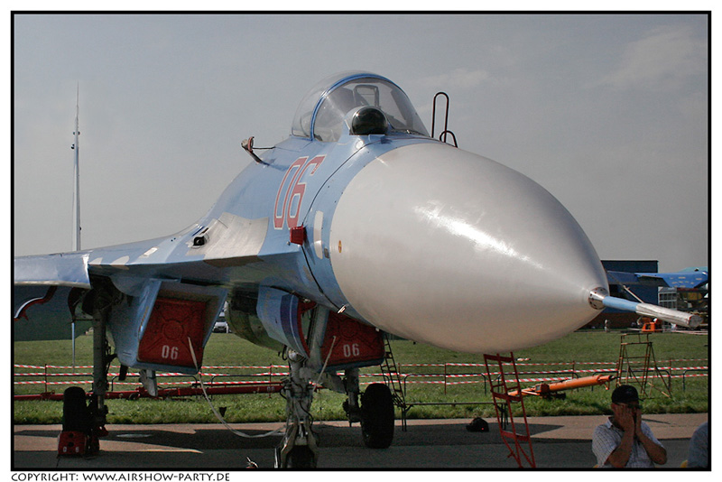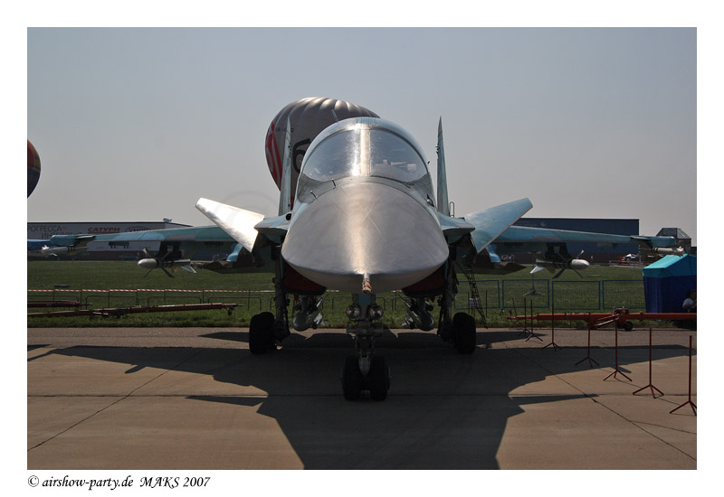 In unserem Frust war uns das affengeile Display der OVT dann fast egal. Nichts konnte unsere Depressionen steigern! Nichts? Na, aber sicher doch! Die gemischte Formation aus Strischi und Knights, sowie das anschließende Display der lang ersehnten russischen Ritter gaben uns den Rest! Wären wir nach dem langen Stehen in der prallen Sonne nicht so durstig gewesen, wir hätten schon lange mit einem kühlen Baltika auf dem roten Platz gesessen. Pünktlich zum Beginn der Mittagspause, welche aus unerfindlichen Gründen über 4 Stunden dauern sollte, passierten wir die Sicherheitsschleuse. Offensichtlich wollte man das MAKS-Gelände zum sichersten Ort der Welt machen, u.a. wurden sämtliche elektronischen Geräte auf Funktion überprüft! Selbst unsere Sonnencreme wurde als potentiell explosiv eingestuft und einer genauen Inspektion unterzogen! Nun ja… 11 Uhr war lange vorbei, es wurde also höchste Zeit, die russischen Gastronomiestände auf Tauglichkeit zu überprüfen. Im Gegensatz zum viel (und zu Recht) gelobten Schaschlik, ist das Bier auf der MAKS geradezu spottbillig. Der Frust saß tief und wollte bekämpft werden, was übrigens bei kuscheligen 35 Grad im nicht vorhandenen Schatten und in praller Sonne nach 1 ½ Bier ausgesprochen zügig funktionierte. Die gute Laune fand sich wieder, als Suchojs Göttin, die SU 34, auf dem Weg in die statische Ausstellung unsere Sphäre kreuzte. Plötzlich war sie da, die erwartete Gänsehautstimmung! Da am Himmel die Pause kein Ende zu finden schien, fanden wir ausreichend Zeit, das fast 2 Kilometer lange static display abzunehmen. Nur ein Wort: Wahnsinn! Die komplette SU 27/30 Familie, MiG 29 in allen Variationen, SU-25, SU-24, MiG 23, 25 und Yak 130, um nur einige der Fighter zu nennen. TU-95 und gleich zwei 160 vertraten die Bomberverbände. Sämtliche Mil und Kamov-Hubschrauber wurden gezeigt. Alles nie zu sehende Modelle im Westen, ebenso wie diverse IL-76, welche teilweise als Versuchsträger für neue Triebwerke fungieren.